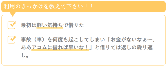 その後に事故(車)を何度も起こしてしまい「お金がないなぁ~、ああアコムに借れば早いな!」と借りては返しの繰り返し。