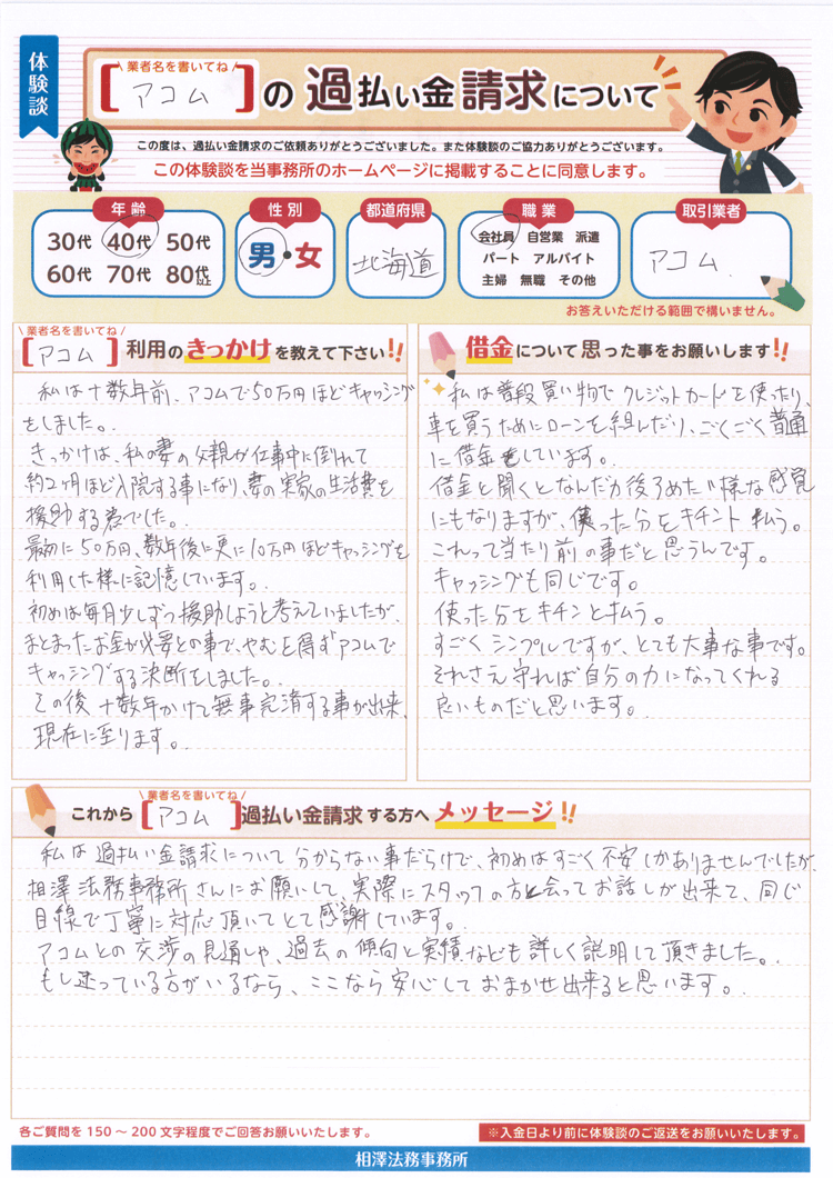 私は過払い金請求について分からない事だらけで、初めはすごく不安しかありませんでしたが、相澤法務事務所さんにお願いして、実際にスタッフの方と会ってお話が出来て、同じ目線で丁寧に対応頂いてとて感謝しています。