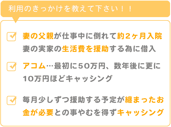 きっかけは、私の妻の父親が仕事中に倒れて約2ヶ月ほど入院する事になり、妻の実家の生活費を援助する為でした。