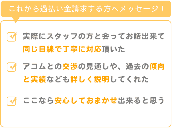 アコムとの交渉の見通しや、過去の傾向と実績なども詳しく説明して頂きました。