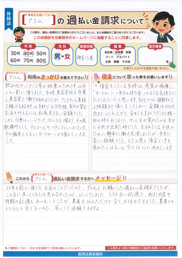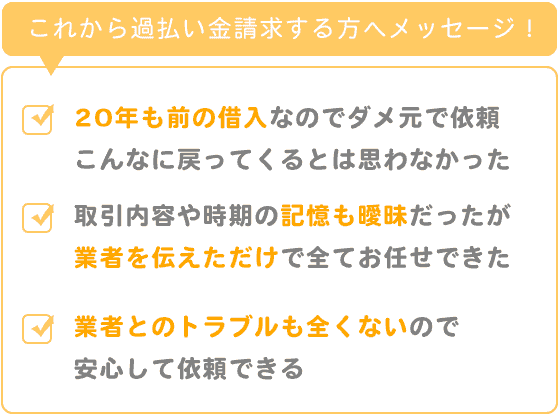 20年も前に借りたお金のことだったので、ダメ元でお願いした過払い金請求でしたが、こんなに戻ってくるとは思わなかったので、びっくりしました。