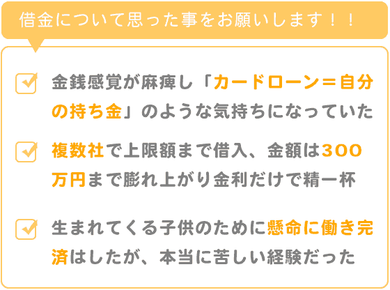 やっと目が覚めたのは自分に子供が出来た時でした。生まれてくる子供のために懸命に働き完済はしましたが、本当に苦しい経験でした。