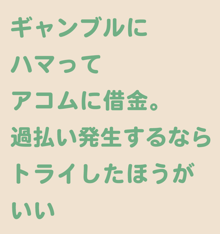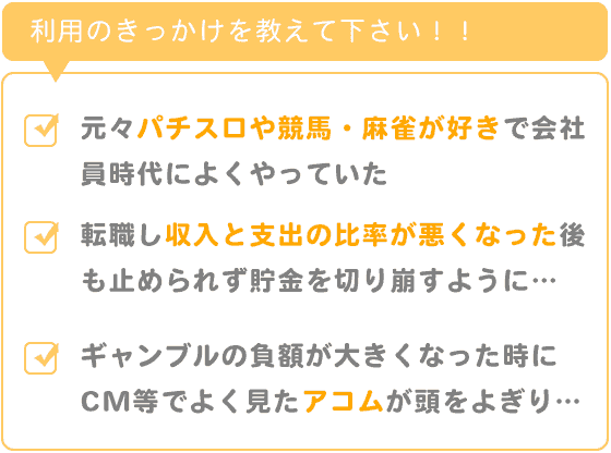 パチスロ自体のギャンブル性がどんどん上がっていった背景もありますが、負ける時の額がかなり大きくなってきた時にCMや街でよく見かけたアコムの事が頭をよぎり借金をしようと思いました。