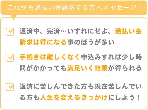 現在も返済中の方、完済後の過払い金請求の方がいらっしゃると思いますが、いずれにせよ得になる事のほうが多いです。