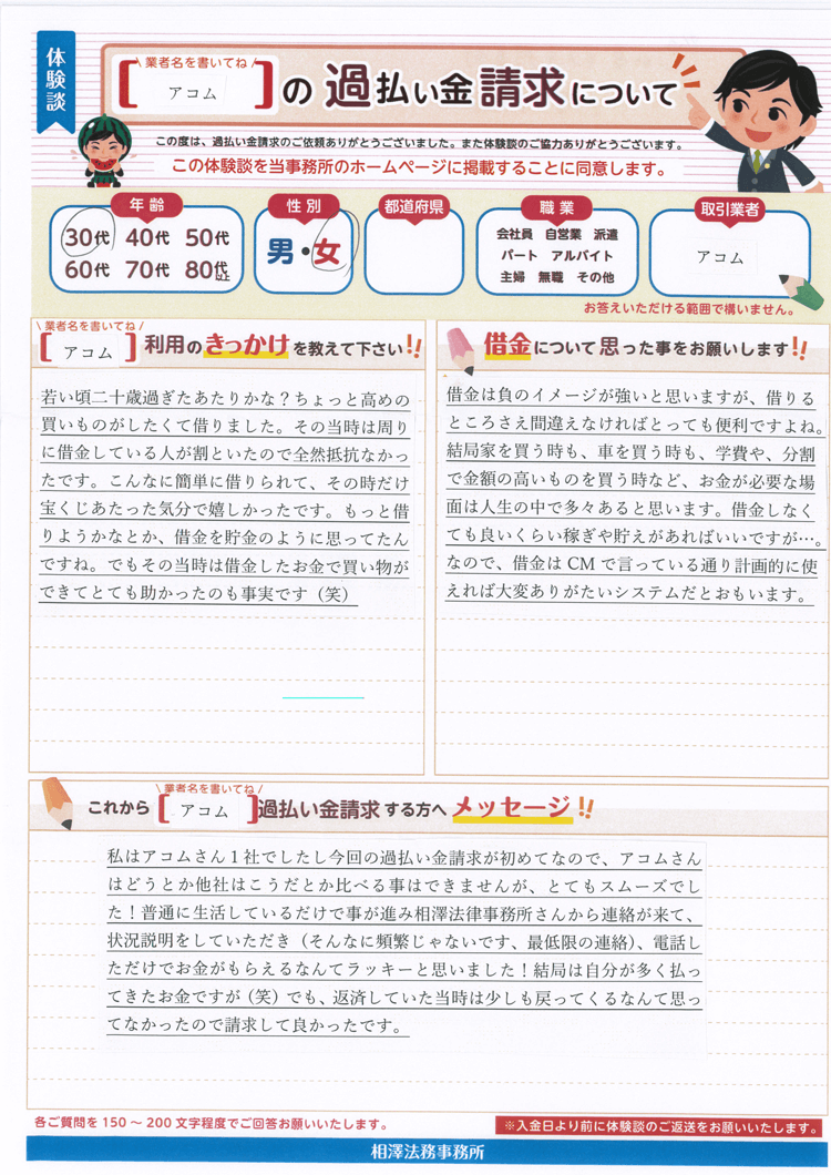 私はアコムさん1社でしたし今回の過払い金請求が初めてなので、アコムさんはどうとか他社はこうだとか比べる事はできませんが、とてもスムーズでした!