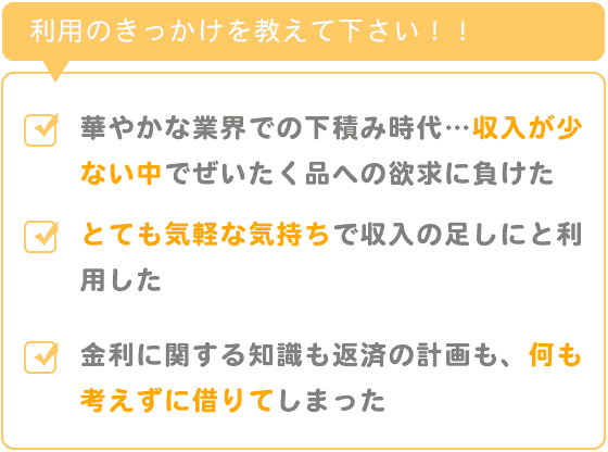 ただとても華やかな業界で、お客様方も富裕層ばかりだったため、収入が少ない中でぜいたく品への欲求に負けてしまったことがきっかけです。
