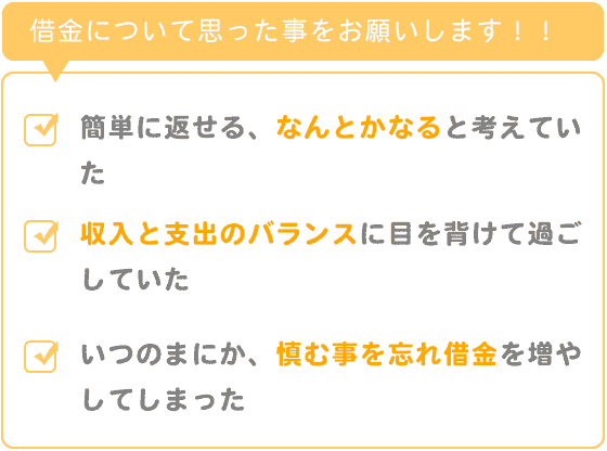 いつのまにか、慎む事を忘れて借金を増やしてしまい、それでも大丈夫という気持ちに身をまかせていました。