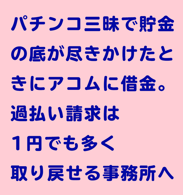アコムは消費者金融業者の中でも三菱UFJ グループ、経営安定、豊富な資金の優良業者で過払金も戻って来やすいみたいですが、私自身が経験して一番重要だと断言できる事務所選びに失敗すると本来の半分も取り戻せない結果になり兼ねないようです。
