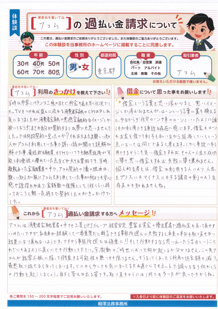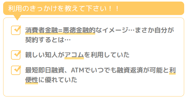 では何故契約に至ったのか?それはたまたま親しい知人がアコムを利用していた事で詳しい話が聞けて誤解が解けた事、最短即日融資、ATMでいつでも融資返済が可能と利便性に優れていた点などが大きい要因です。