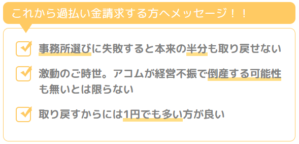 今、激動のご時世において何が起こるか分かりません。この先アコムが経営不振に陥って倒産する可能性も無いとは限りません。そうなってしまったら折角の返金額も減り、最悪取り返せなくなってしまいます。
