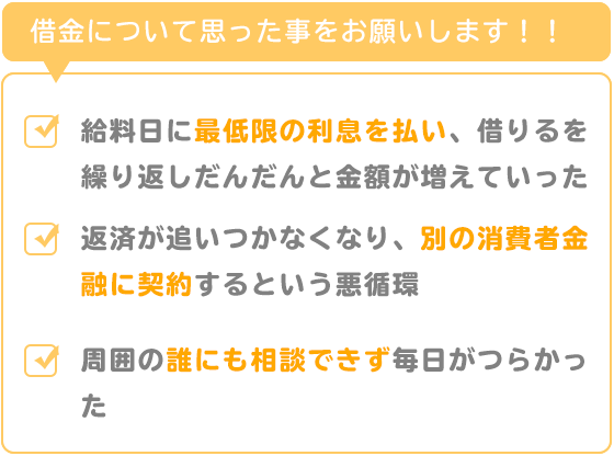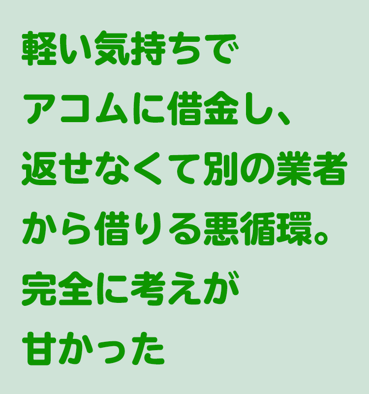 給料日に最低限の利息を払い、 延ばし延ばししている間にも少しづつ借りていくという事を繰り返してだんだんと金額が増えていき、とうとう返済が追いつかなくなりました。
