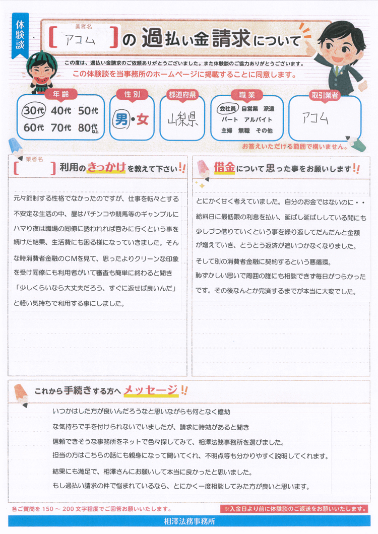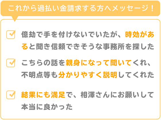 いつかはした方が良いんだろうなと思いながらも何となく億劫な気持ちで手を付けられないでいましたが、請求に時効があると聞き信頼できそうな事務所をネットで色々探してみて、相澤法務事務所を選びました。