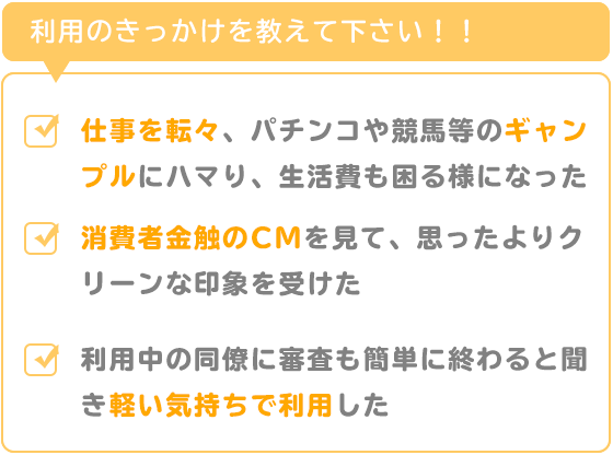 そんな時消費者金触のCMを見て、思ったよりクリーンな印象を受け同僚にも利用者がいて審査も簡単に終わると聞き「少しくらいなら大丈夫だろう、すぐに返せば良いんだ」と軽い気持ちで利用する事にしました。