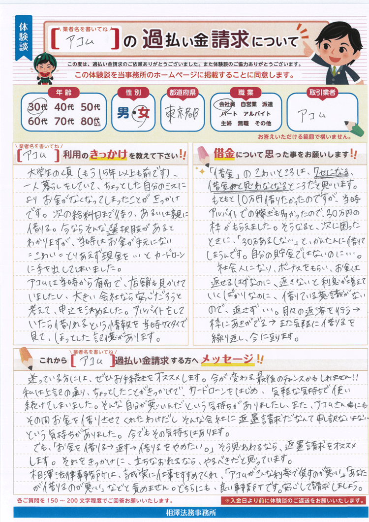 相澤法律事務所は、誠実に仕事をすすめてくれて、「アコムがこんな利率で貸すのが悪い」「あなたが借りるのが悪い」などと責めません。