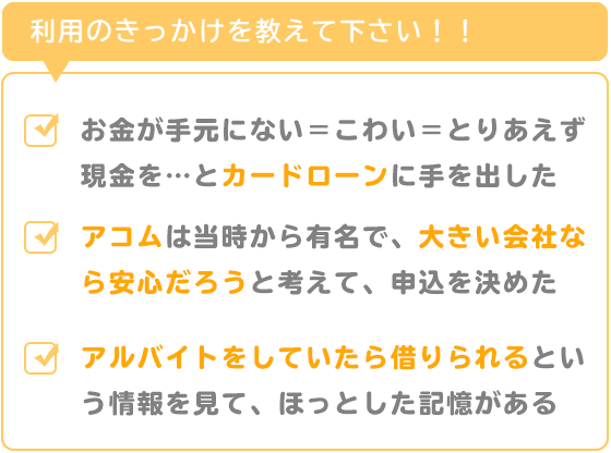 アコムは当時から有名で、店舗も見かけていましたし、大きい会社なら安心だろうと考えて、申込を決めました。