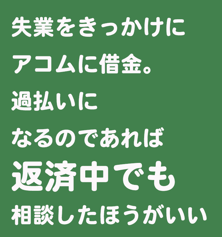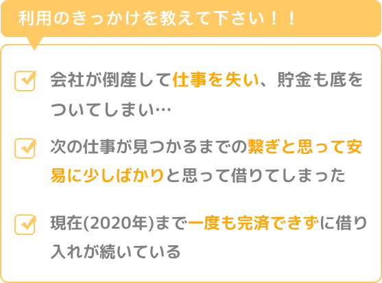 会社が倒産して仕事を失い、毎月の給料がなくなり貯金も底をついて次の仕事が見つかるまでの繋ぎと思って安易に苦し紛れに少しばかりと思って借りてしまったのがそもそものきっかけです。