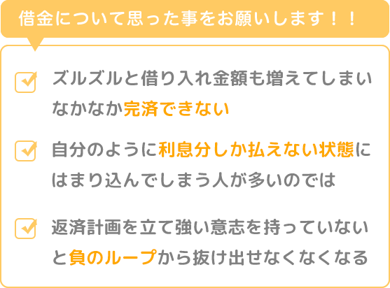 安易に借り入れ出来てしまうからズルズルと借り入れ金額も増えてしまい、なかなか完済できないで、自分のように利息分しか払えない状態にはまり込んでしまう人が多いのではないかと思います。