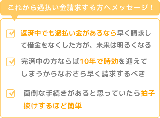 また完済中の方ならば10年で時効を迎えてしまうからなおさら早く請求するべきです。