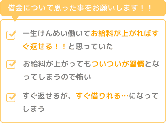 若かったので一生けんめい働いてお給料が上がればすぐ返せる!!と思っていたけどお給料が上がってもついついが習慣となってしまうので怖いと思った。