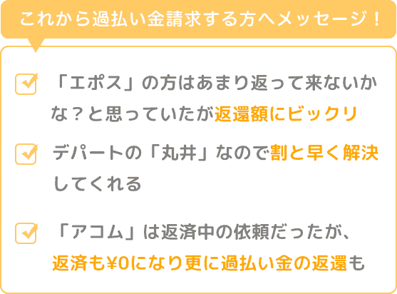 今回私は「アコム」の過払い金請求だけの予定でしたが…ふっともしかして「エポスも?」と何年も前に完済していたエポスカードを思い出しました。限度額も高くなかったので「エポス」の方はあまり返って来ないかな?と思っていましたがだいぶ返還される事となりビックリしています。デパートの「丸井」なので割と早く解決してくれる様です。