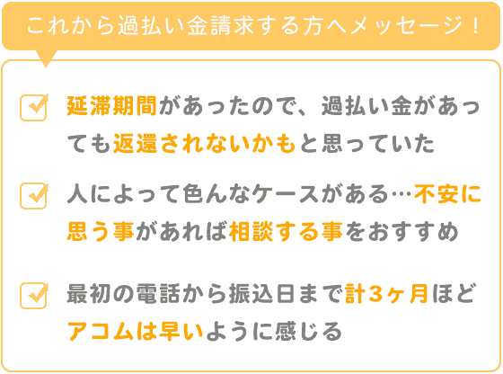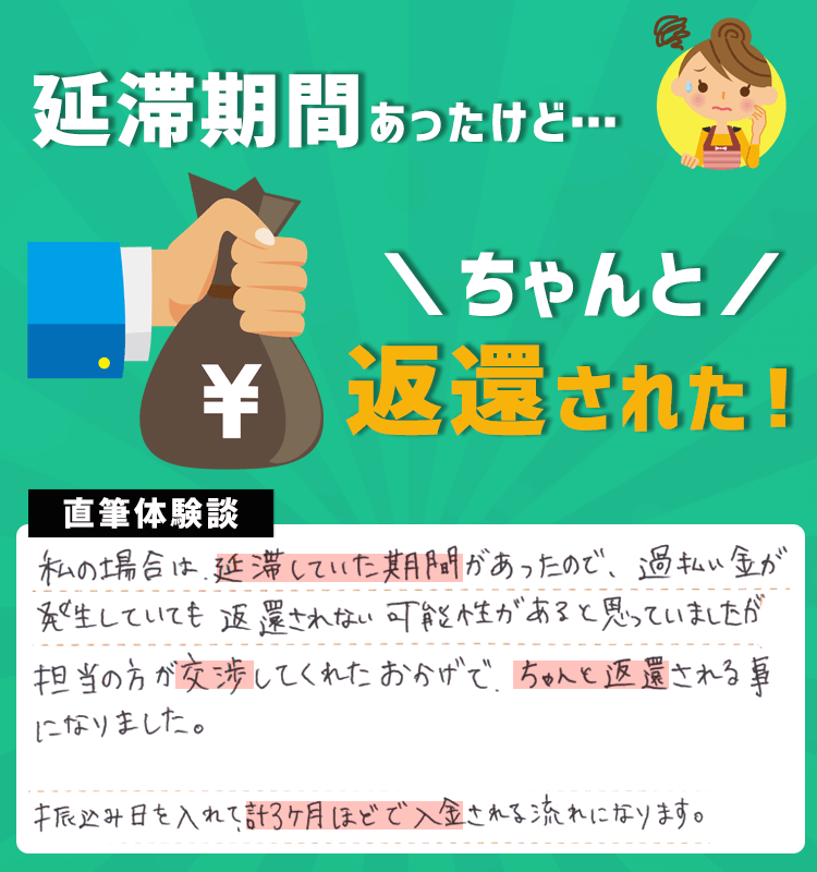 私の場合は、延滞していた期間があったので、過払い金が発生していても返還されない可能性があると思っていましたが担当の方が交渉してくれたおかげで、ちゃんと返還される事になりました。
