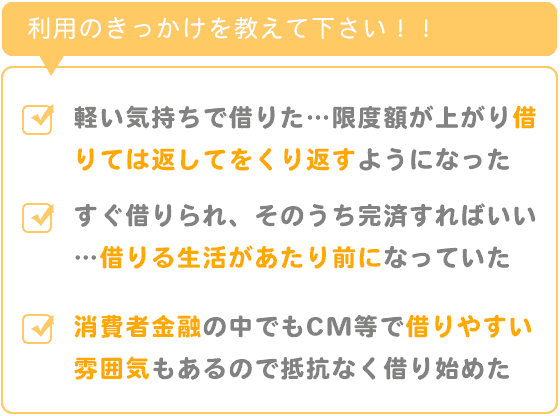 消費者金融の中でも借りやすい雰囲気もあるので(CMイメージなど)抵抗なく借り始めたように思います。