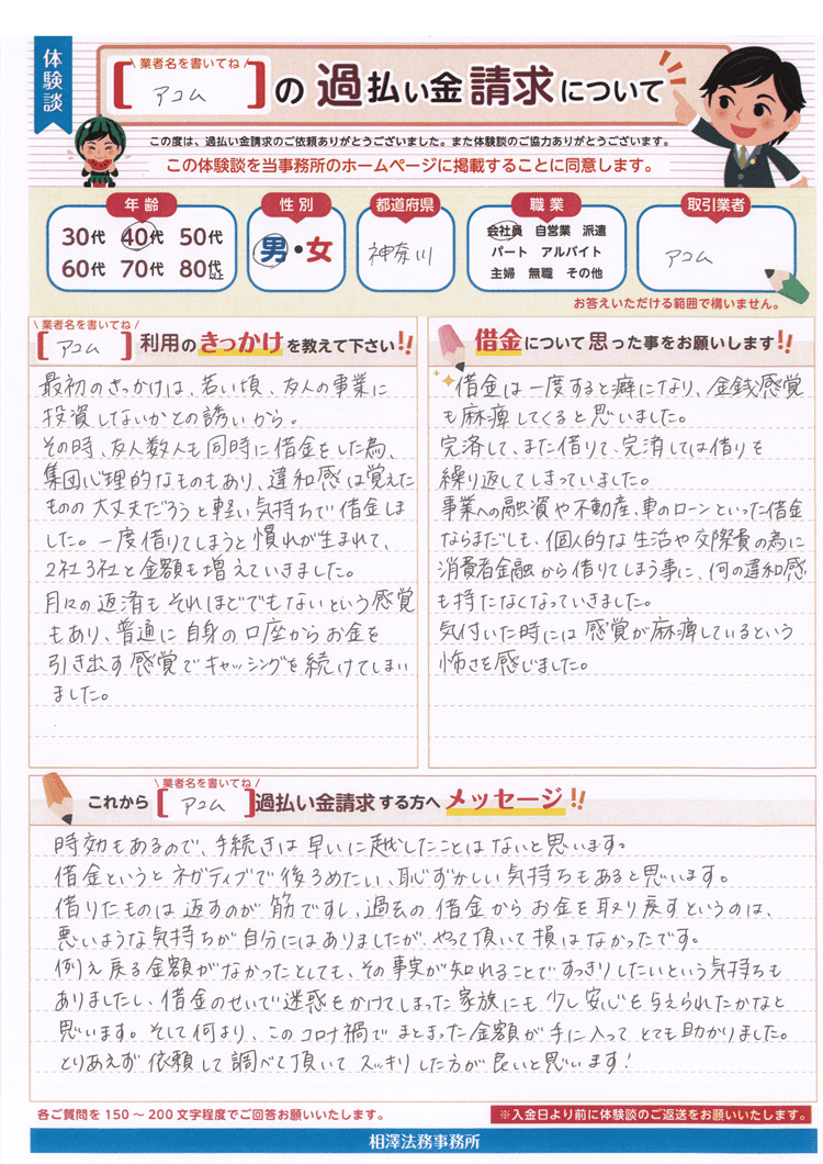 借りたものは、返すのが筋ですし、過去の借金からお金を取り戻すというのは、悪いような気持ちが自分にはありましたが、やって頂いて損はなかったです。