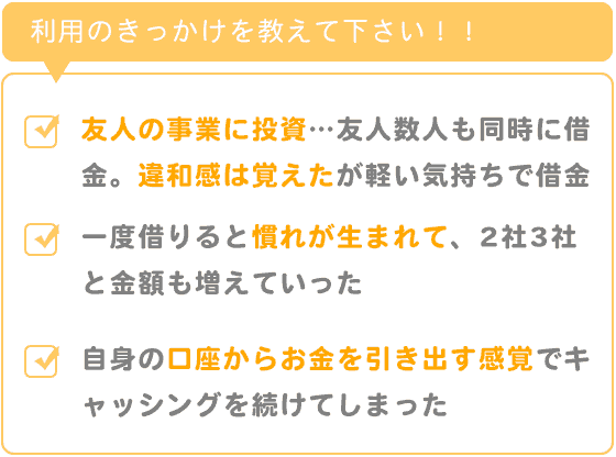 その時、友人数人も同時に借金をした為、集団心理的なものもあり、違和感は覚えたものの大丈夫だろうと軽い気持ちで借金しました。