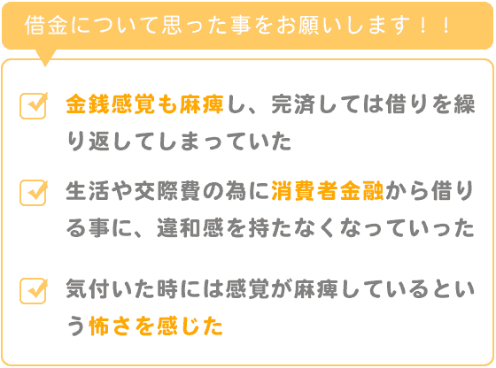 借金は一度すると癖になり、金銭感覚も麻痺してくると思いました。