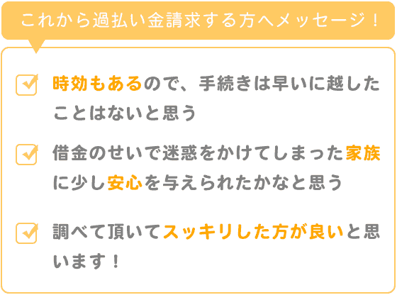 例え戻る金額がなかったとしても、その事実が知れることですっきりしたいという気持ちもありましたし、借金のせいで迷惑をかけてしまった家族にも少し安心を与えられたかなと思います。