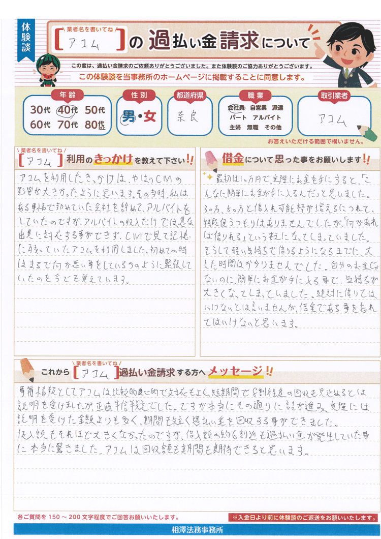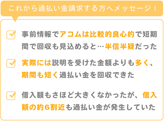 事前情報としてアコムは比較的良心的で対応もよく、短期間で8割程度の回収も見込めるとは説明を受けましたが、正直半信半疑でした。