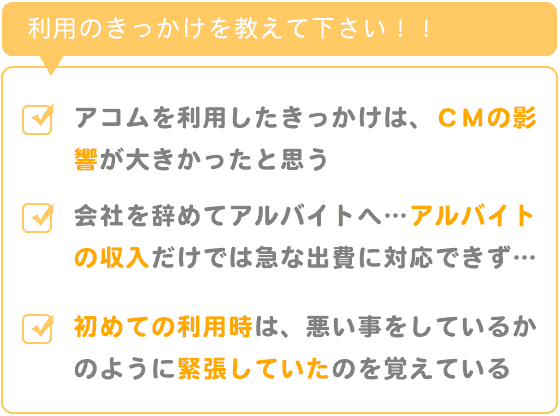 その当時、私はある事情で勤めていた会社を辞めて、アルバイトをしていたのですが、アルバイトの収入だけでは急な出費に対応する事ができず、CMで見て記憶に残っていたアコムを利用しました。