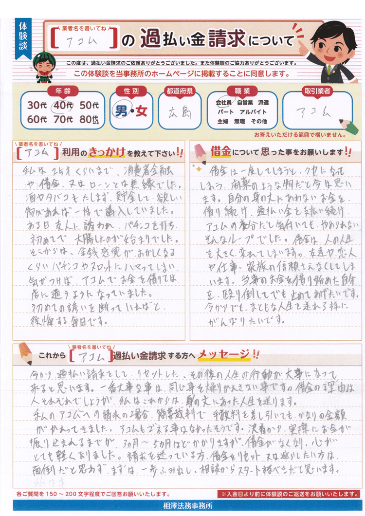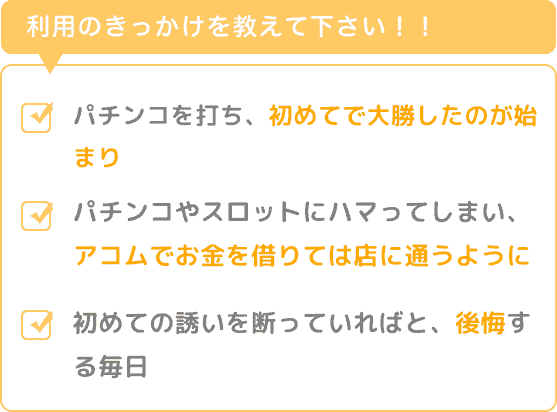 ある日友人に誘われ、パチンコを打ち、初めてで大勝したのが始まりでした。そこからは、金銭感覚がおかしくなるくらいパチンコやスロットにハマってしまい、気がつけば、アコムでお金を借りては、店に通うようになっていました。初めての誘いを断っていればと、後悔する毎日です。