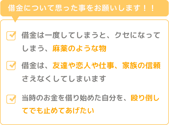 当時のお金を借り始めた自分を、殴り倒してでも止めてあげたいです。今からでも、まともな人生を送れる様にがんばりたいです。