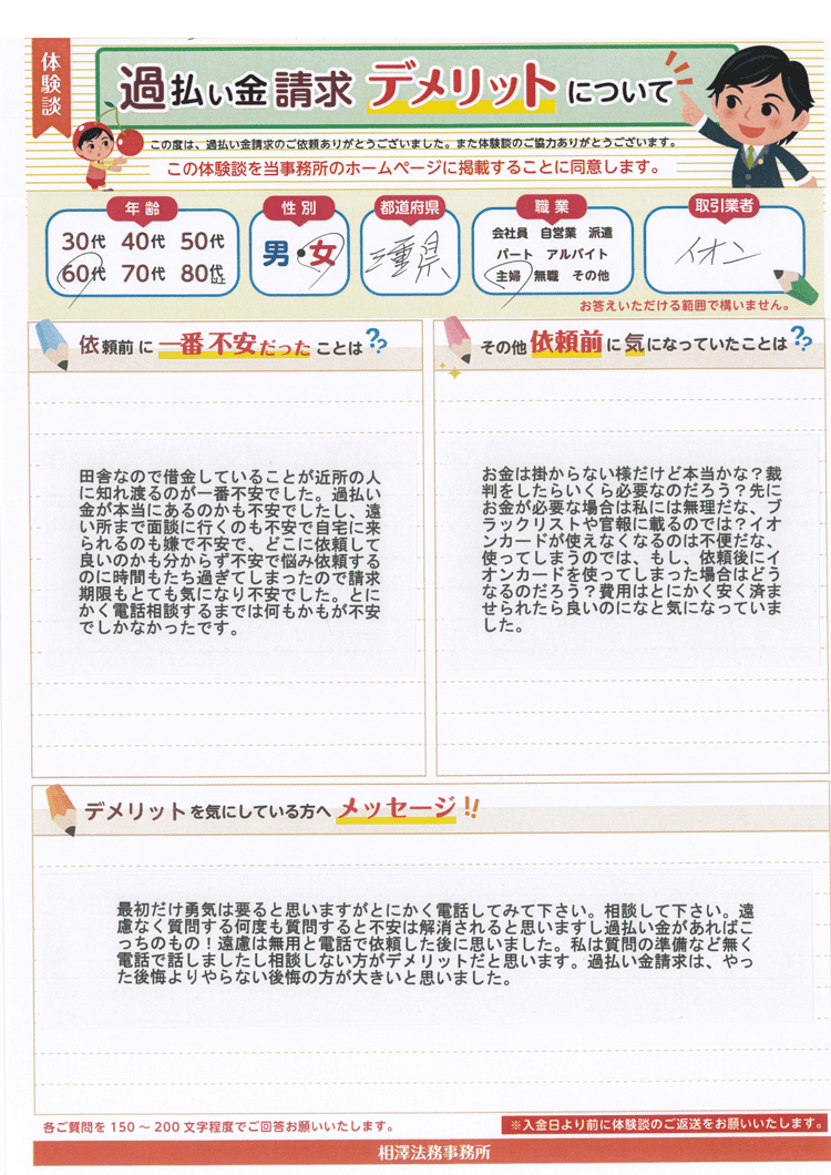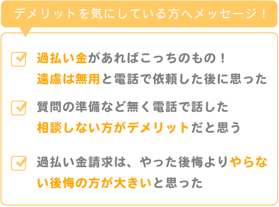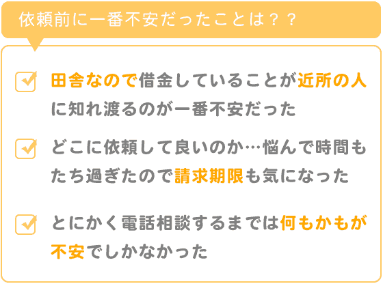 過払い金が本当にあるのかも不安でしたし、遠い所まで面談に行くのも不安で自宅に来られるのも嫌で不安で、どこに依頼して良いのかも分からず不安で悩み依頼するのに時間もたち過ぎてしまったので請求期限もとても気になり不安でした。
