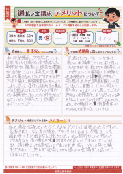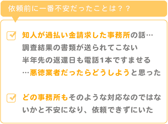 私が依頼前に不安だったことは、以前知人が過払い金請求した事務所が、調査した結果の書類が送られてこない、半年先の返還日も電話の1本ですませる所だったと聞き、「悪徳業者だったらどうしよう」と思っていました。