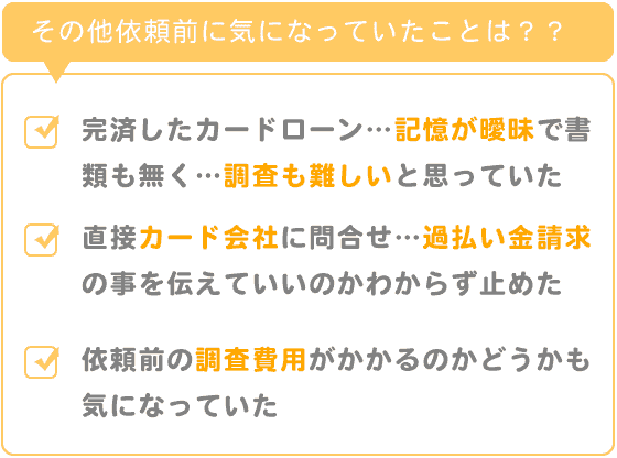 完済したカードローンがあり、過払い金請求したいとずっと思っていたのですが、完済してから数年たっていた為、ローンの開始した時期や返済額がわかる書類が手元に何も無かったので、調査も難しいと思っていました。