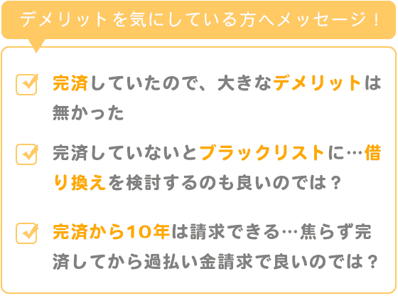 私の場合、完済していたので、大きなデメリットは無かったのですが、完済されていない方の場合、ブラックリストにのり、今後ローンを組む時に不利益になると聞きました。