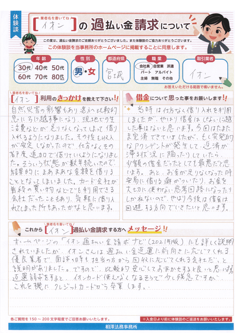ホームページの「イオン過払い金請求ナビ(2021年版)にも詳しく説明されていましたが、イオンさんは過払い金返還に前向きに応じてくれる優良業者で、面談の時も担当の方から回収に応じてくれる会社だ、と説明がありました。