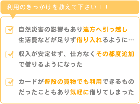 自然災害の影響もあり遠方へ比較的急に引っ越す事になり、現地での生活費などが足りなくなってしまって借り入れるようになりました。
