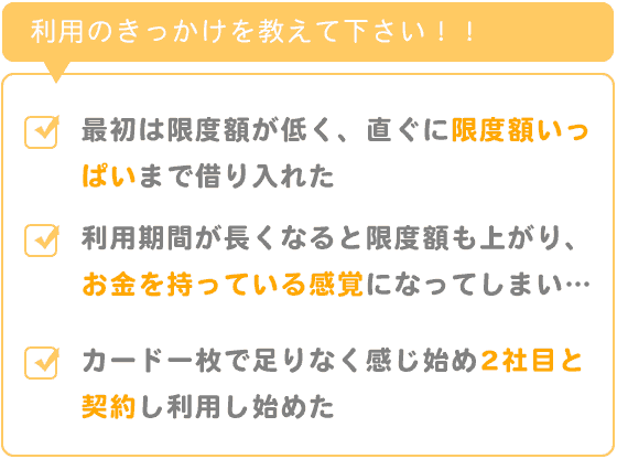 利用期間が長くなると限度額も上がり、お金を持っている感覚になってしまいどんどん利用が増え、そうなるとキャッシングカード一枚で足りなく感じ始め2社目と契約し利用を始めました。