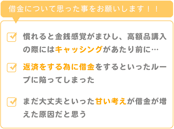 まだ大丈夫といった甘い考えが借金が増えていった原因であったと思います。