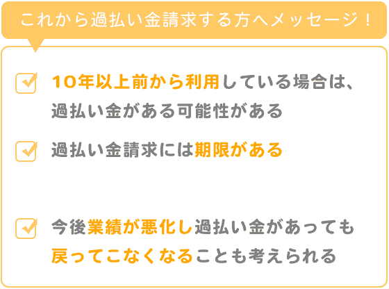 請求できる期限もありますしまた今後業績が悪化し過払い金があったとしても戻ってこなくなることも考えられますので一歩前に踏み出す後押しになればなと思っております。