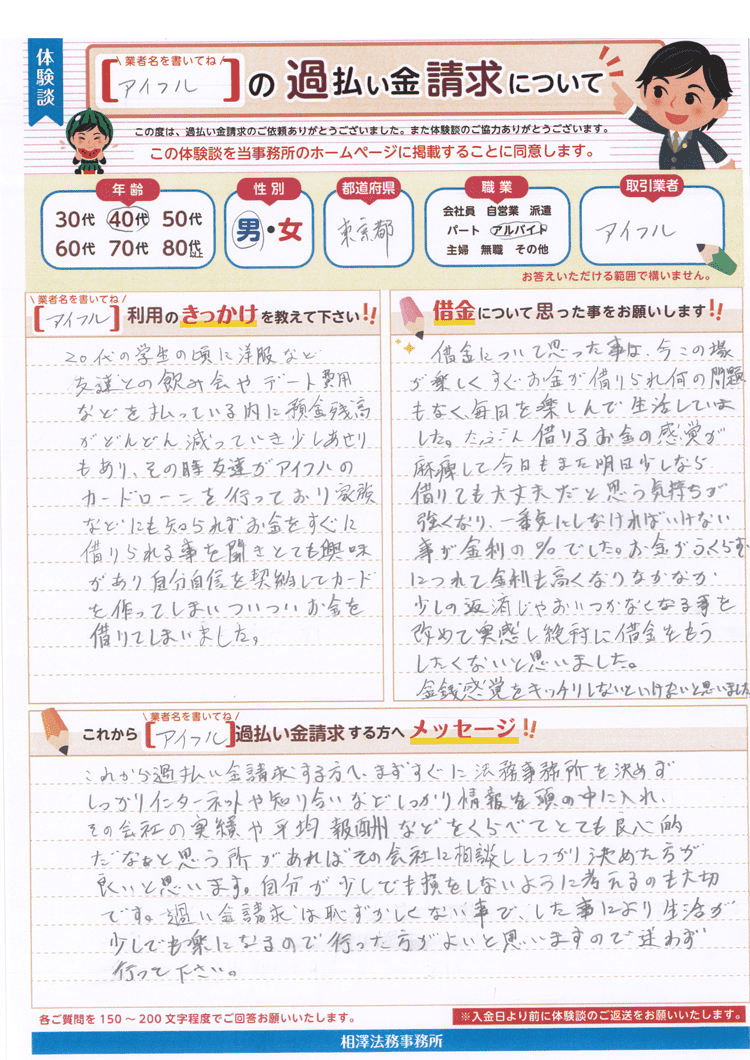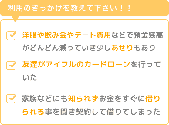 20代の学生の頃に洋服など友達との飲み会やデート費用などを払っている内に預金残高がどんどん減っていき少しあせりもあり、その時友達がアイフルのカードローンを行っており家族などにも知られずお金をすぐに借りられる事を聞きとても興味があり自分自身で契約してカードを作ってしまいついついお金を借りてしまいました。