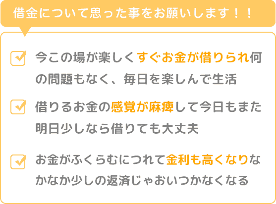 借金について思ったことは、今この場が楽しくすぐお金が借りられ何の問題もなく、毎日を楽しんで生活していました。たぶん借りるお金の感覚が麻痺して今日もまた明日少しなら借りても大丈夫だと思う気持ちが強くなり、一番気にしなければいけない事が金利の%でした。