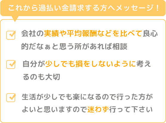 これから過払い金請求する方へ、まずすぐに法務事務所を決めずしっかりインターネットや知り合いなどしっかり情報を頭の中に入れ、その会社の実績や平均報酬などをくらべてとても良心的だなぁと思う所があればその会社に相談ししっかり決めた方が良いと思います。