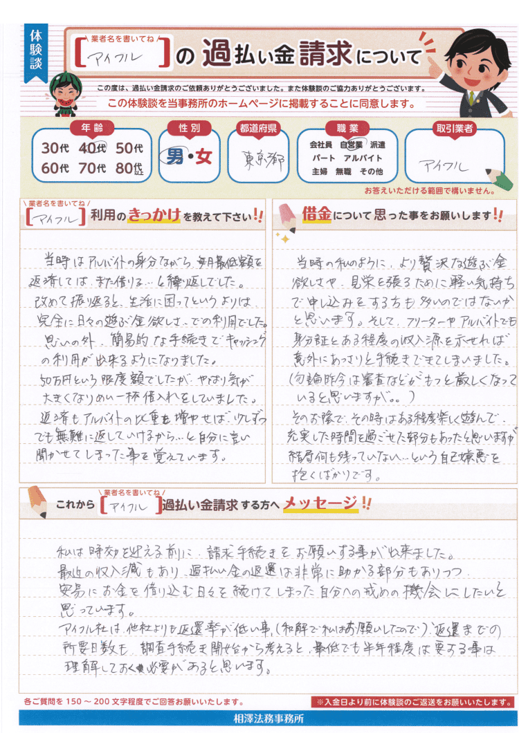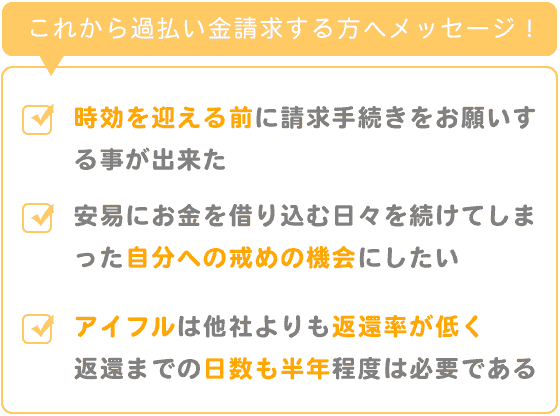 アイフル社は他社よりも返還率が低い事、(和解で私はお願いしたので)返還までの所要日数も調査手続き開始から考えると、最低でも半年程度は要する事は理解しておく必要があると思います。