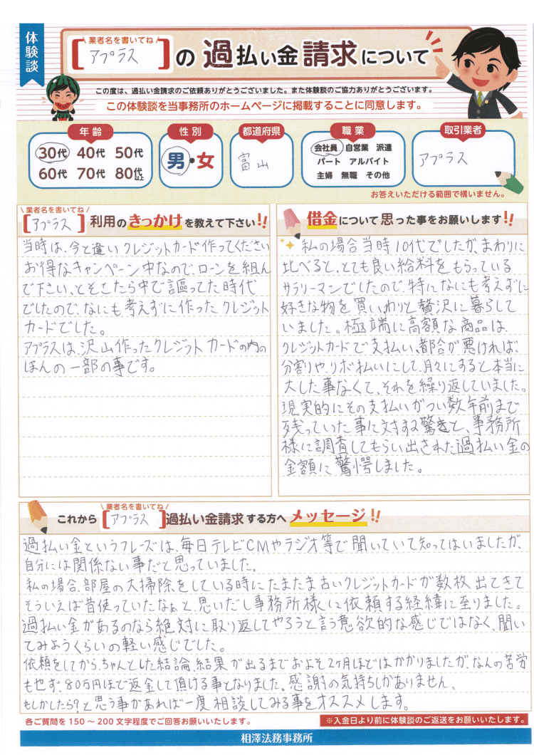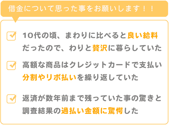 現実的にその支払いがつい数年前まで、残っていた事に対する驚きと、事務所様に調査してもらい出された過払い金の金額に驚愕しました。