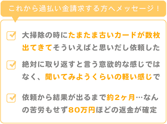 依頼をしてから、ちゃんとした結論、結果が出るまでおよそ2ヶ月ほどはかかりましたが、なんの苦労もせず、80万円ほど返金して頂ける事となりました。