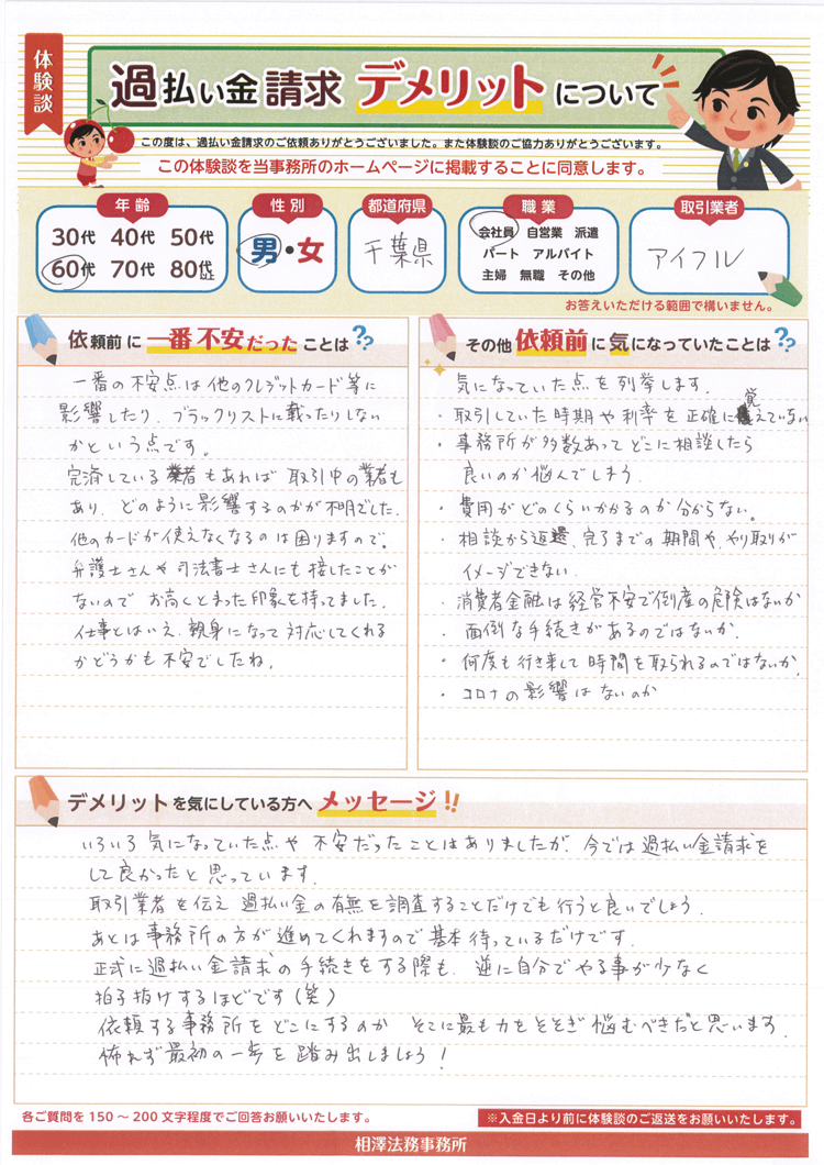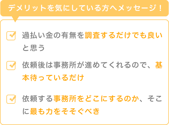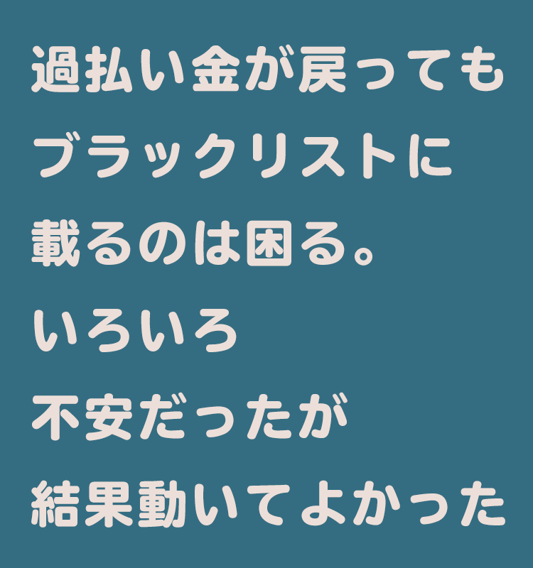 いろいろ気になっていた点や不安だったことはありましたが、今では過払い金請求をして良かったと思っています。